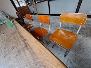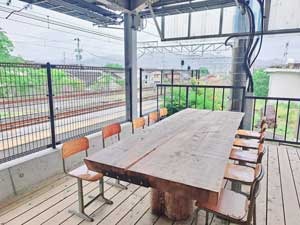 プラットフォームと繋がる、かつて駅舎として使われていた名残を感じるテラス席や、小学校でからの御下がりと思われる可愛い椅子が迎えてくれます。